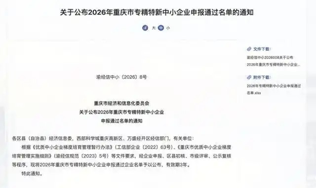 2026年重庆市专精特新中小企业申报通过名单。